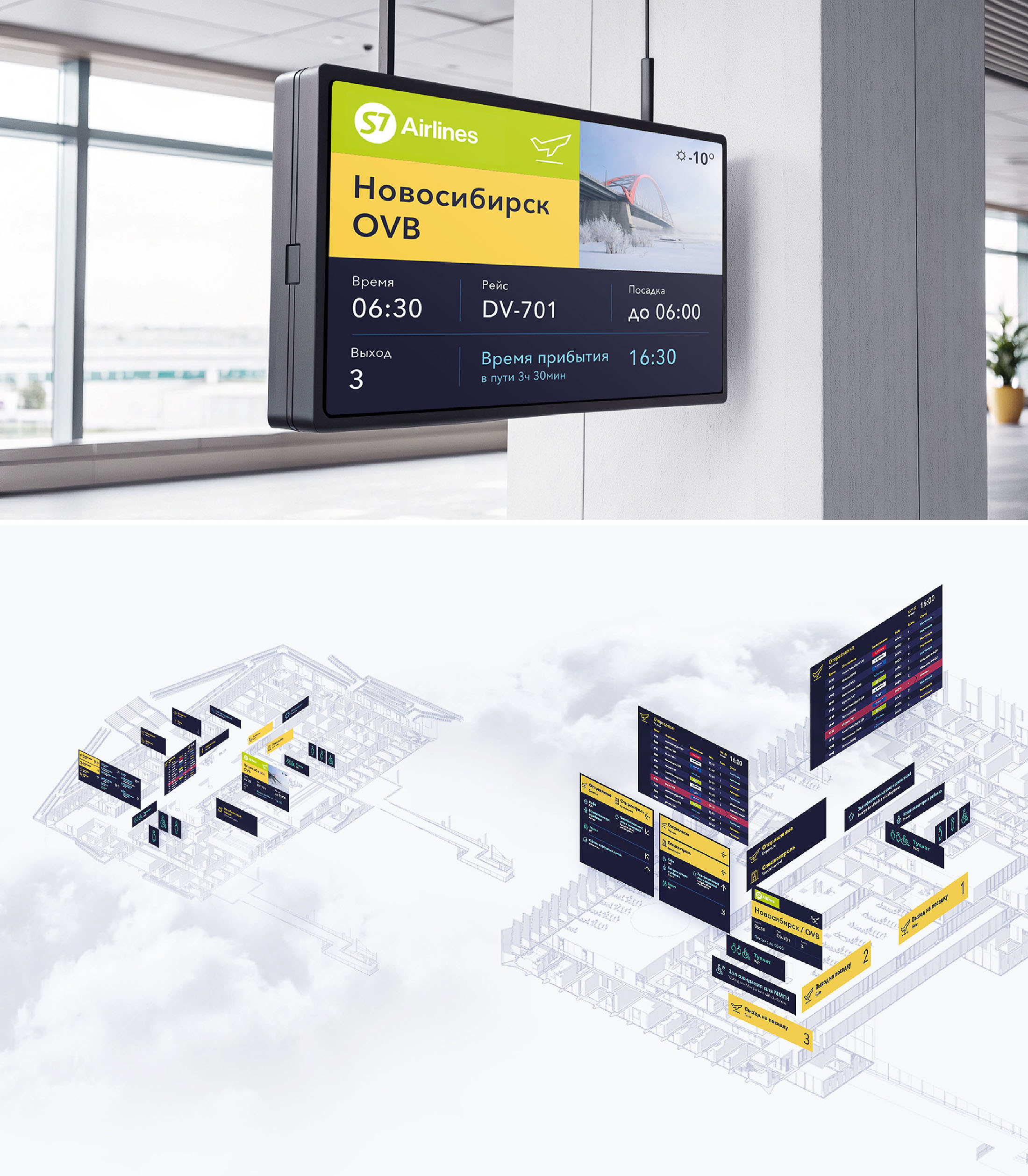 Для удобства восприятия информации была внедрена двухступенчатая цветовая идентификация, которая определяет степень важности данных и выделяет основную информацию, связанную с рейсами, посадкой и регистрацией. Основным выделяющим цветом является желтый, фоновым — темно-синий. Дополняют палитру природные оттенки, вдохновленные северным сиянием, символизируя ночное небо и сияющее полярное солнце. Такое цветовое решение делает навигацию интуитивно понятной, гармоничной и выразительной.